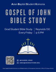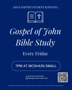Asian Baptist Student Koinonia (ABSK) is an Affiliated Protestant Ministry at Georgetown focused on making the Christian faith relevant to Asian American undergraduate and graduate students through Bible Study and fellowship with one another. At ABSK, you will find a group of students who endeavor to experience life to its fullest by loving God and loving one another in true fellowship. We love to study God’s Word, eat together, play sports, or hang out and get to know each other. Join us this semester for Friday Bible studies and Sunday gatherings!
